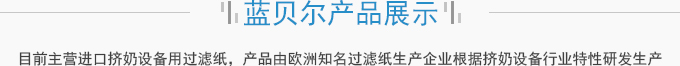 濟南藍貝爾工貿有限公司主要產品擠奶設備過濾紙,牛奶過濾紙,擠奶機過濾袋,目前主營進口擠奶設備用過濾紙,產品由歐洲知名過濾紙生產企業根據擠奶設備行業特性研發生產,產品符合歐盟食品接觸標準及FDA食品接觸標準,產品在擠奶設備過濾紙行業占有70%以上的份額。并通過了SGS標準技術檢測中心按國標食品級標準進行的檢測。產品適用于各種擠奶設備品牌,本公司目前獲得該區域產品營銷資格。產品已用于國內各大乳企所屬牧...